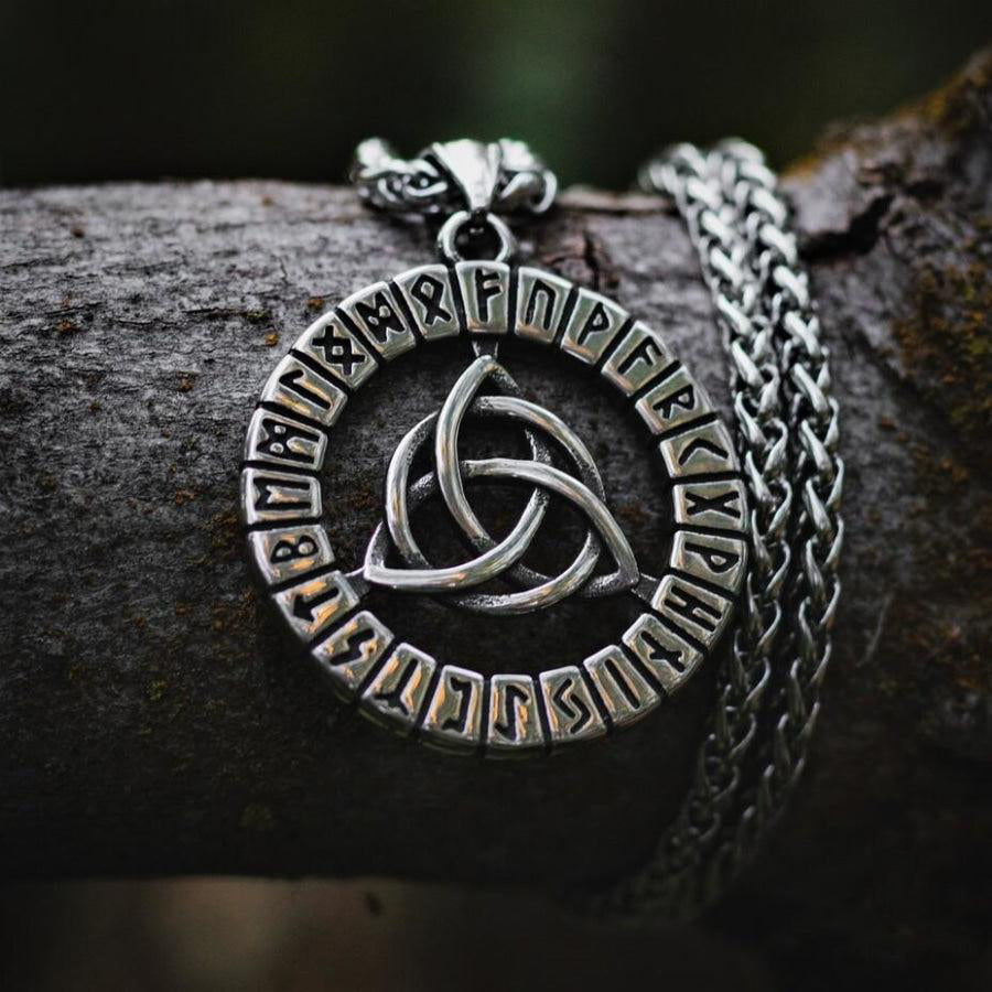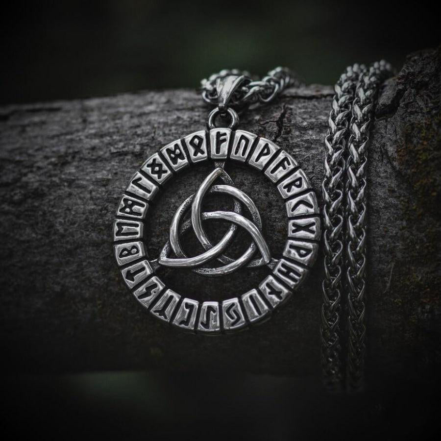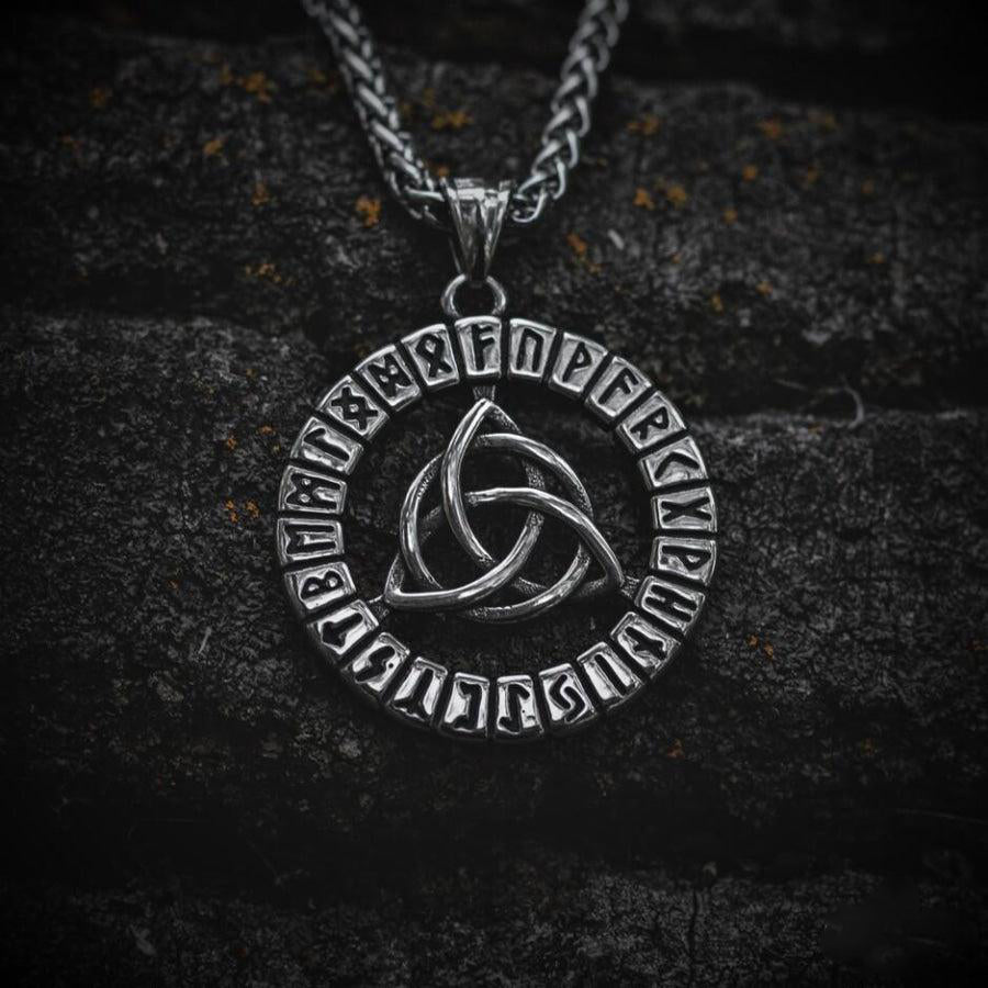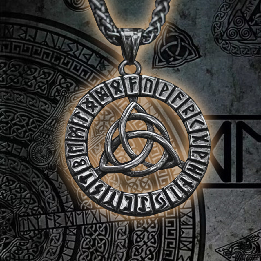 In this unique Viking necklace, the sacred symbolism of the Norse runes meets the timeless elegance of the Celtic Trinity Knot. The intricate knotwork, representing the interconnectedness of mind, body, and spirit, is interwoven with the mysterious inscriptions of the Elder Futhark, the ancient Norse alphabet. Crafted with meticulous attention to detail, this necklace is a testament to the artistry of Viking jewelry and the profound wisdom of the old ways. Wear it to carry a reminder of the sacred unity that binds all things and the eternal cycle of birth, death, and rebirth.