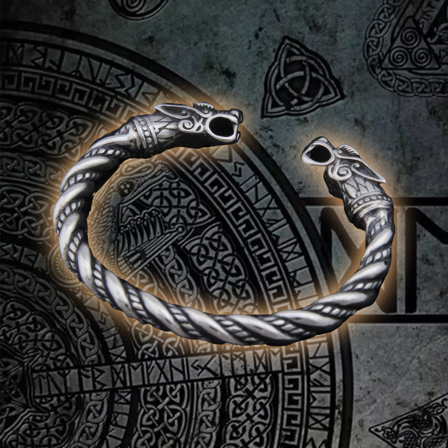 This braided Viking bracelet, adorned with dragon heads, is inspired by the rich art style of the Vikings. The bracelet's body features an intricate twisting spiral motif, while the ends are crowned with stylized dragon heads, reminiscent of those found on brooches, rune stones, and wooden artifacts.