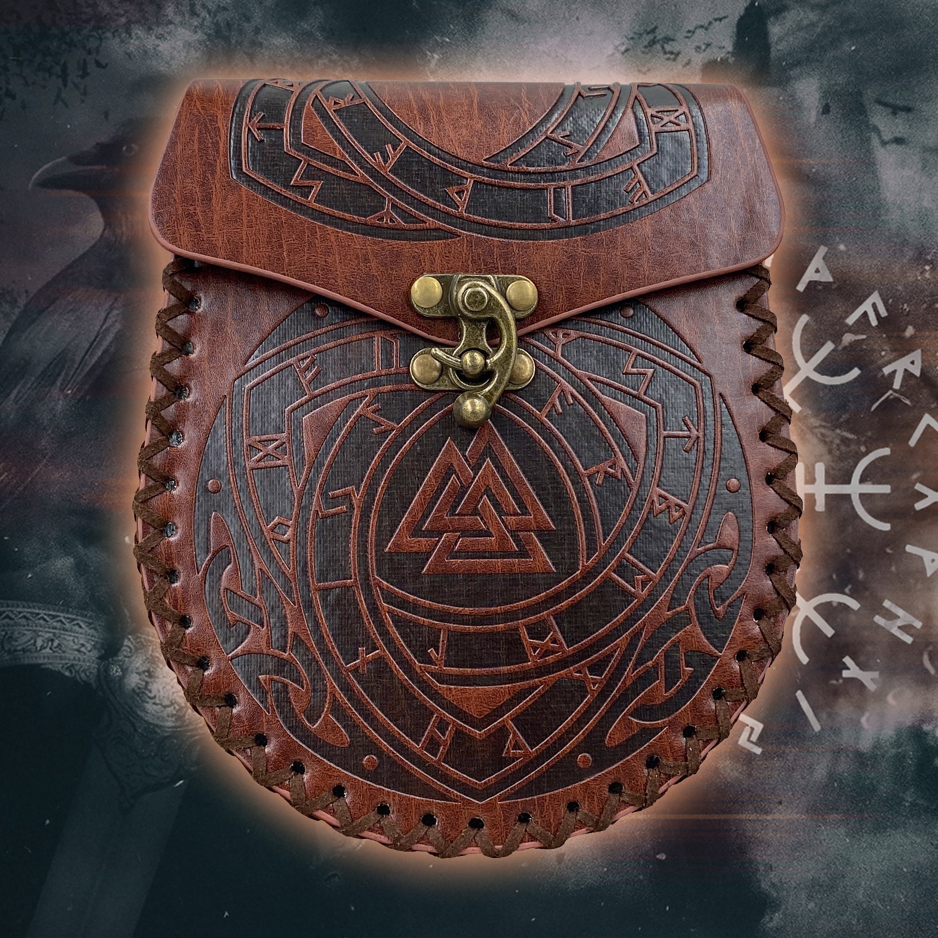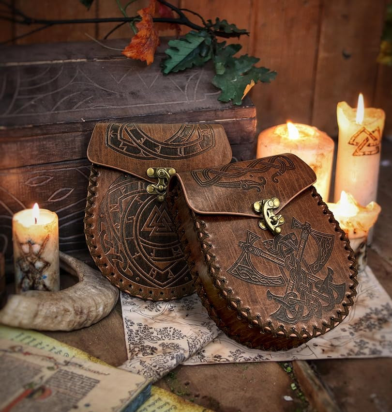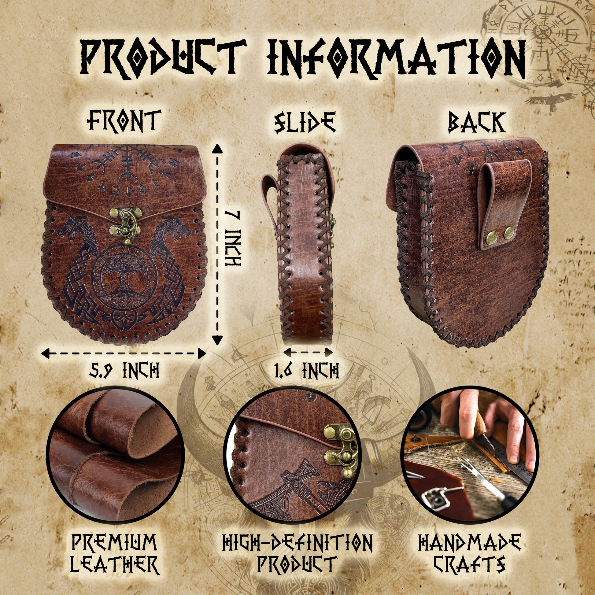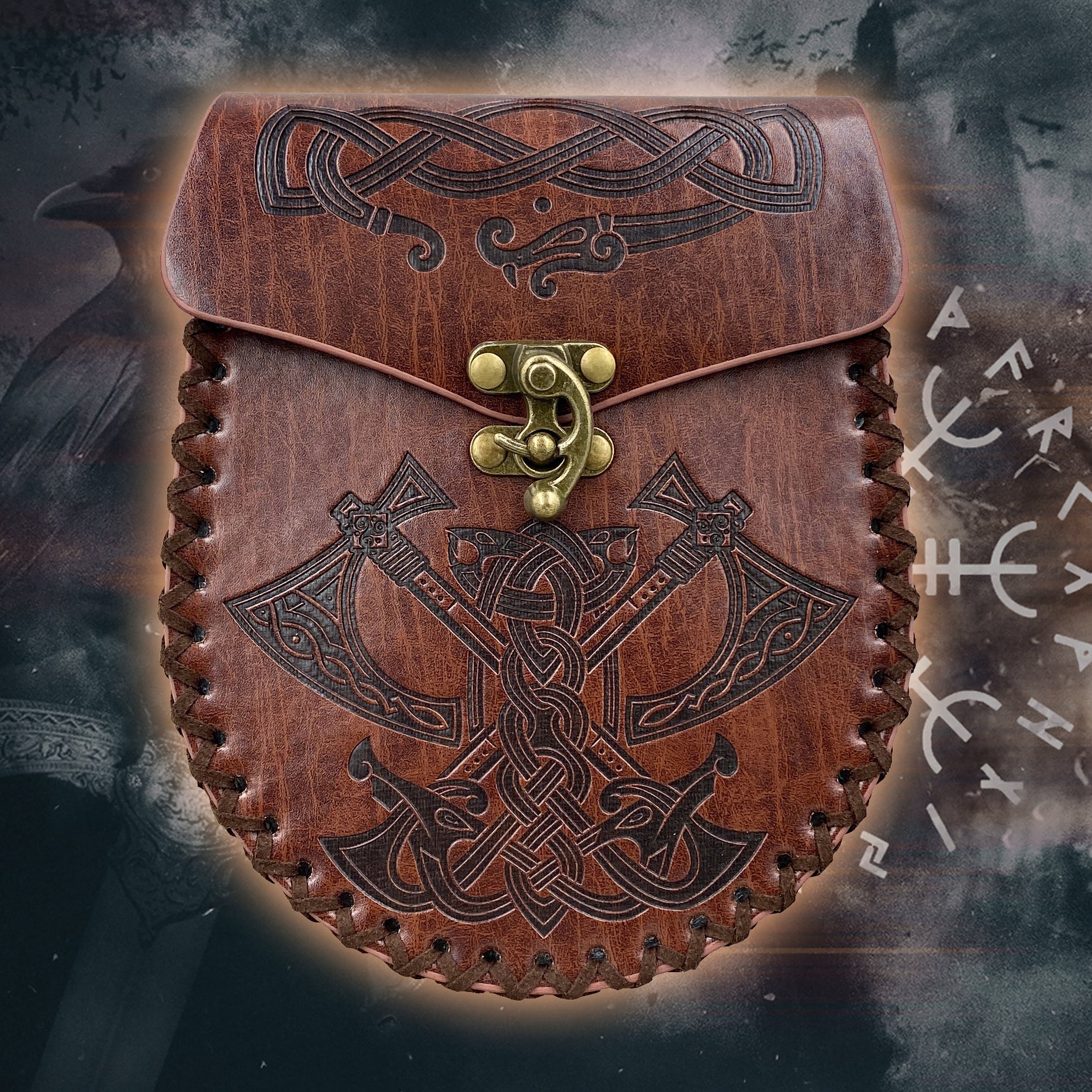 Crafted from the finest faux leather, each pouch is meticulously hand-cut and assembled to ensure durability and quality that stands the test of time. This medieval-inspired accessory is not just a bag, but a portal to the era of Vikings and warriors.