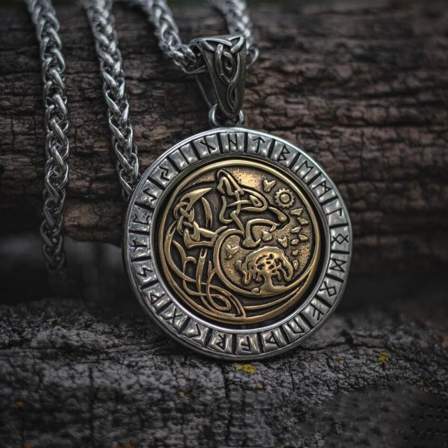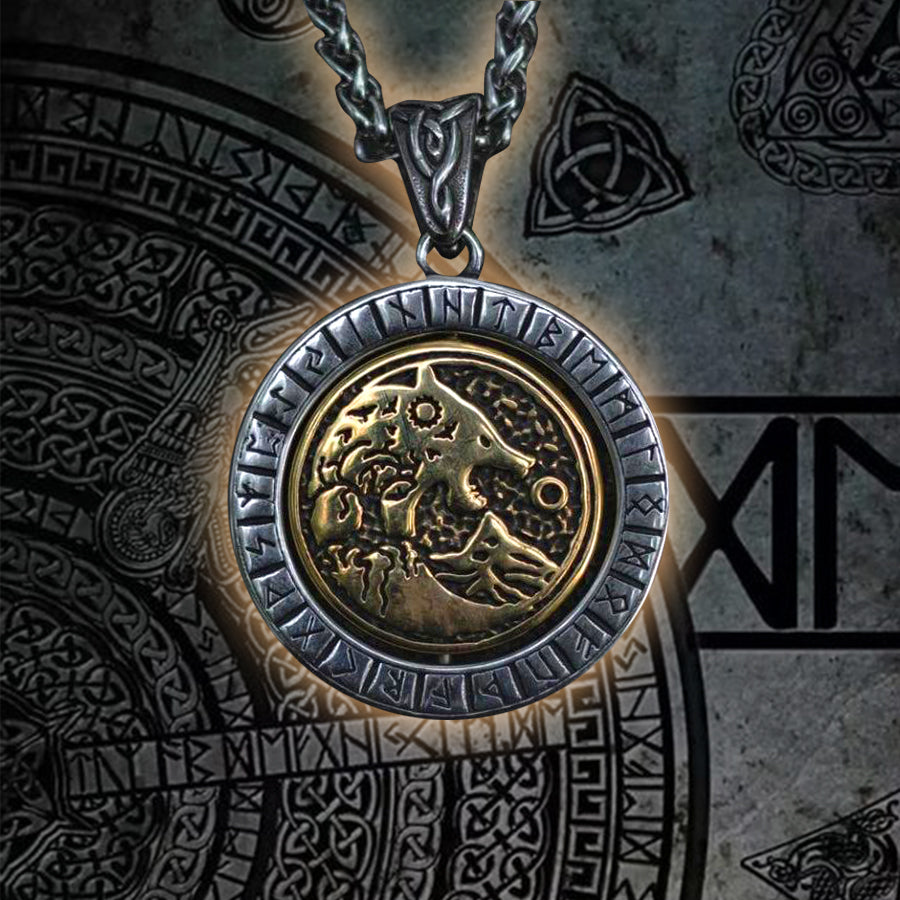 Fenrir, the fierce wolf of Norse legend, embodies the untamed strength and wild spirit of the Viking warriors. This Viking pendant, crafted from stainless steel with a dual-tone finish, portrays Fenrir encased within a circle of ancient Elder Futhark runes. Wear this piece of Viking jewelry as a symbol of your inner warrior, guiding you toward uncharted heights of power and self-discovery.