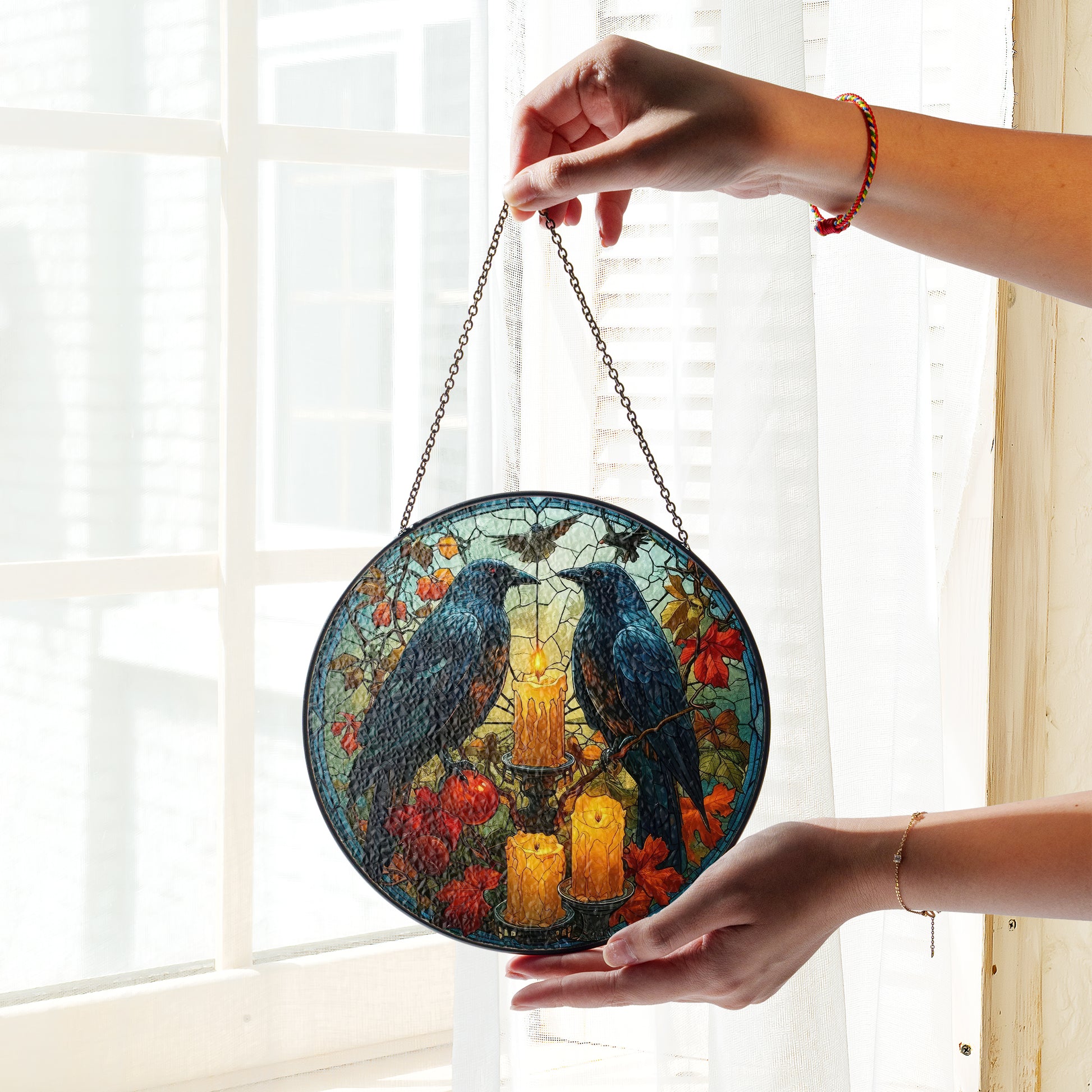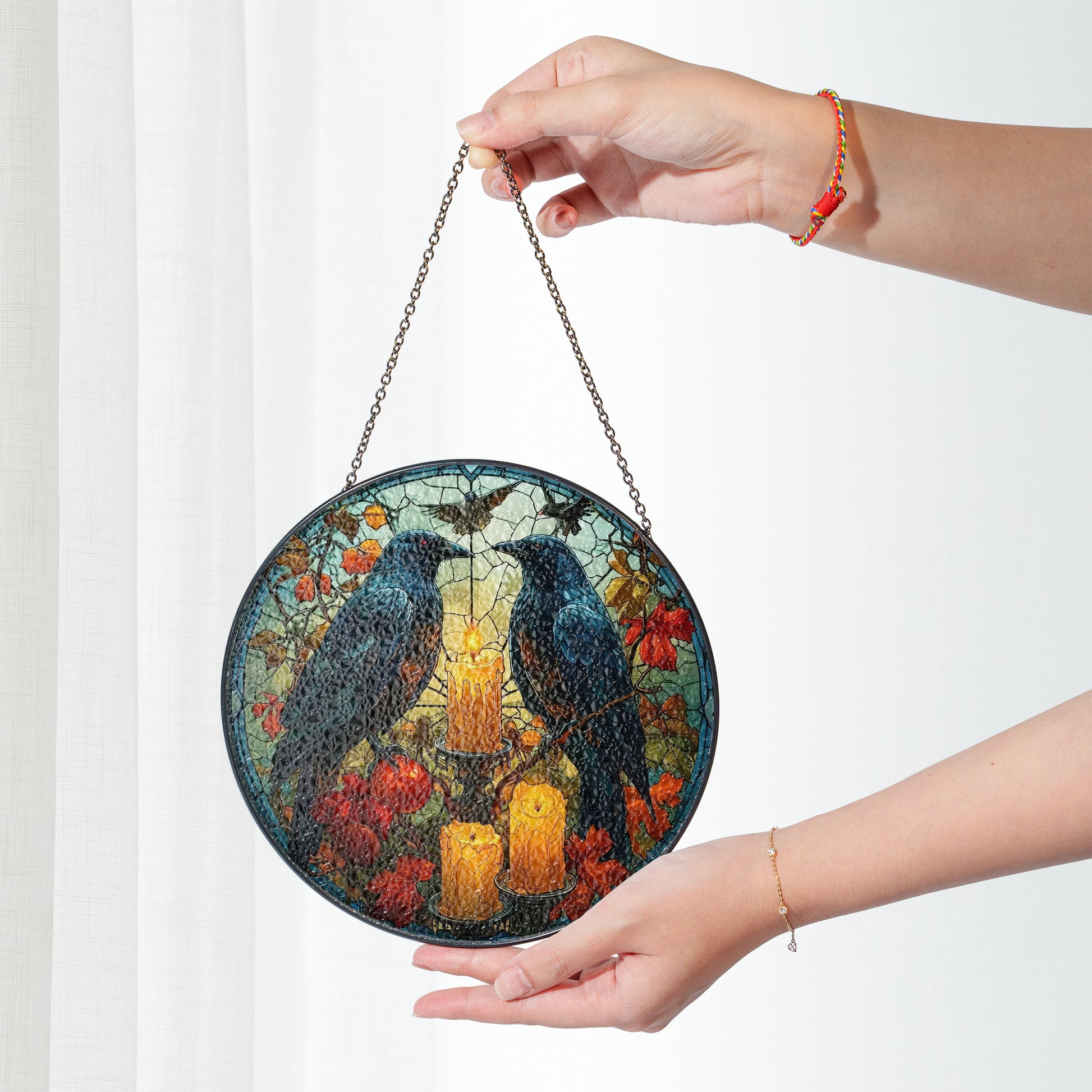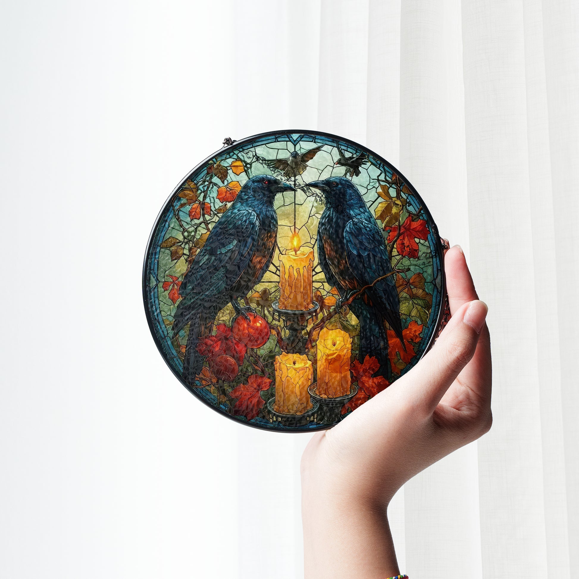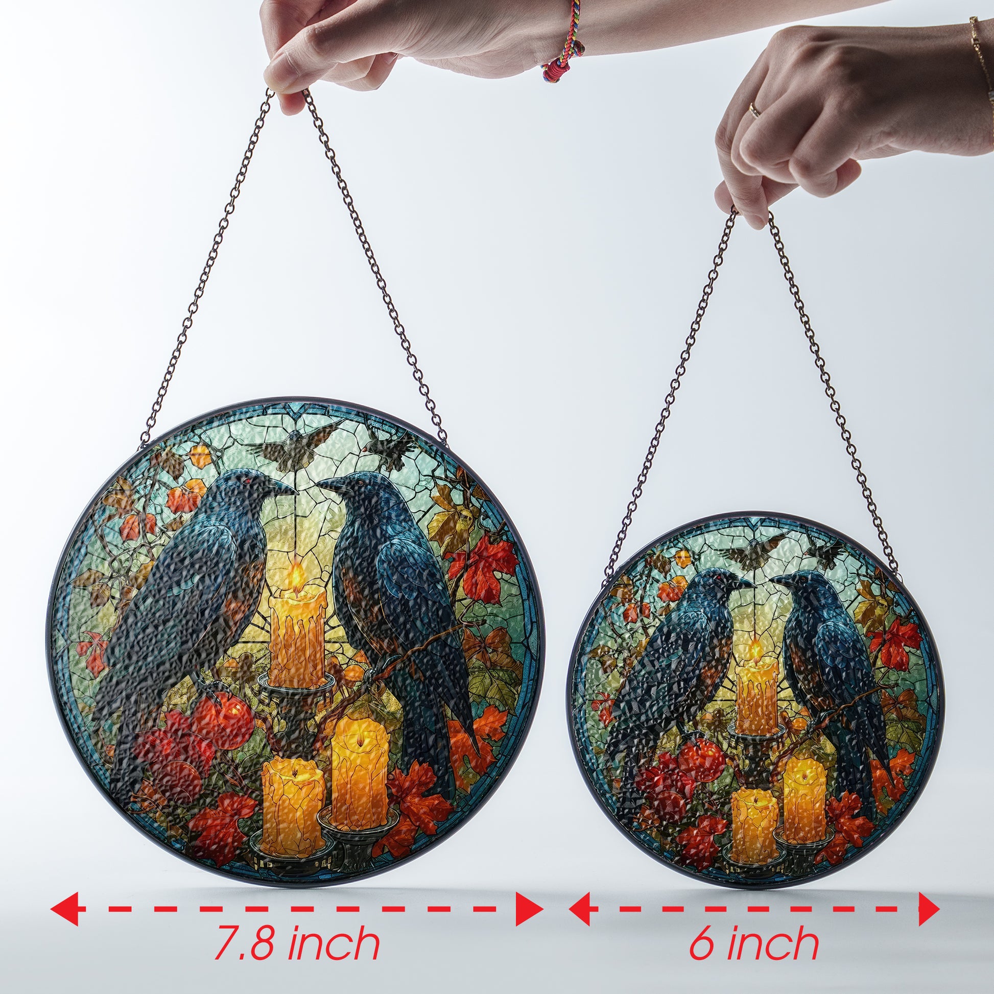 Crafted with 0.5-cm thick glass and reinforced zinc strips along the edges, these ornaments are as durable as they are beautiful. Designed for easy installation, they come with a black metal chain and sucker cup, perfect for hanging on windows, walls, or doors. Available in two sizes—6-inch and 7.8-inch—our stained glass ornaments fit seamlessly into any room or decor style.