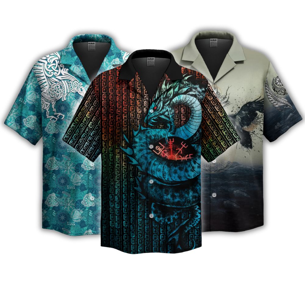 Our Hawaiian Collection blends the vibrant charm of tropical designs with the powerful symbols of Norse mythology, creating a truly one-of-a-kind look that represents bold Viking heritage with a modern twist.