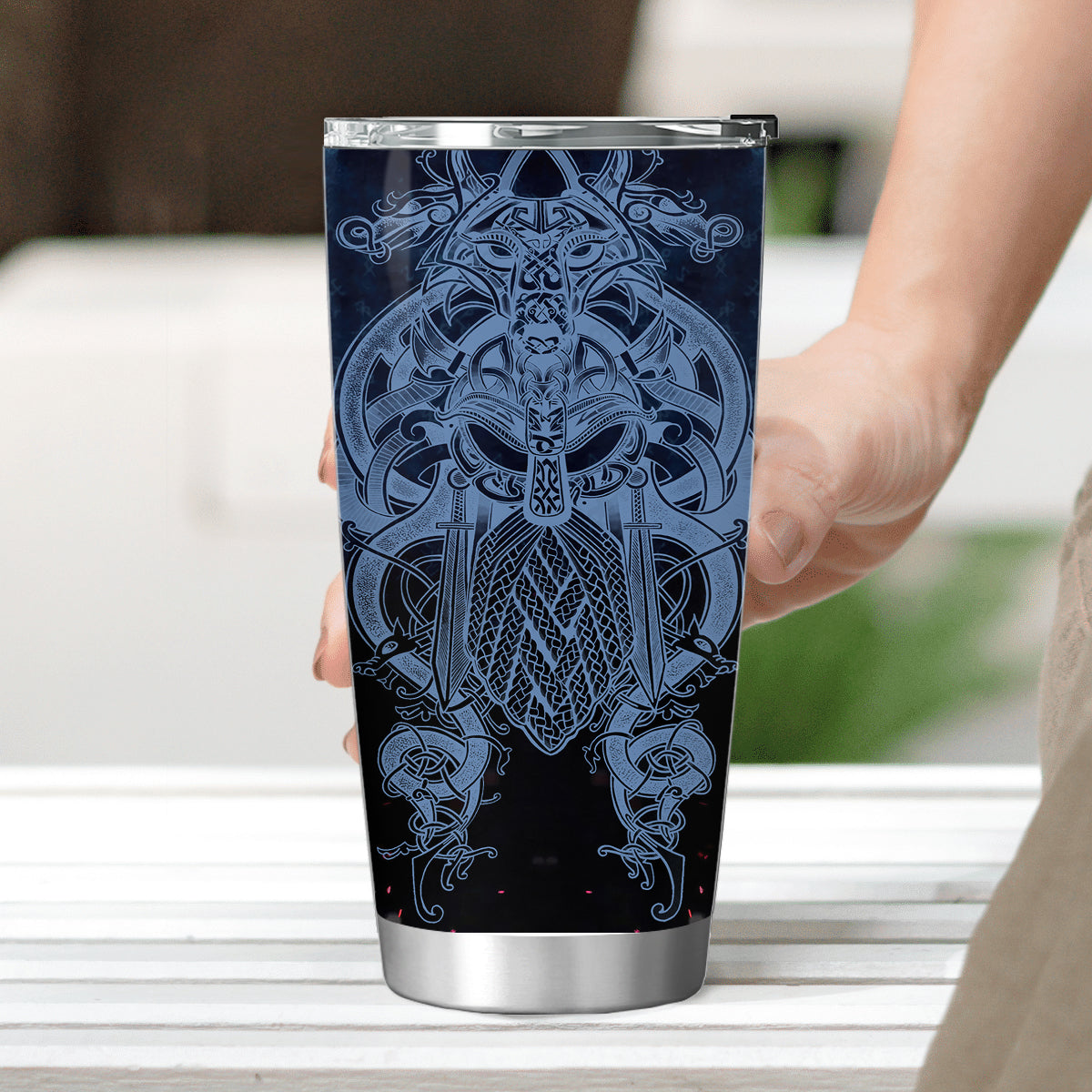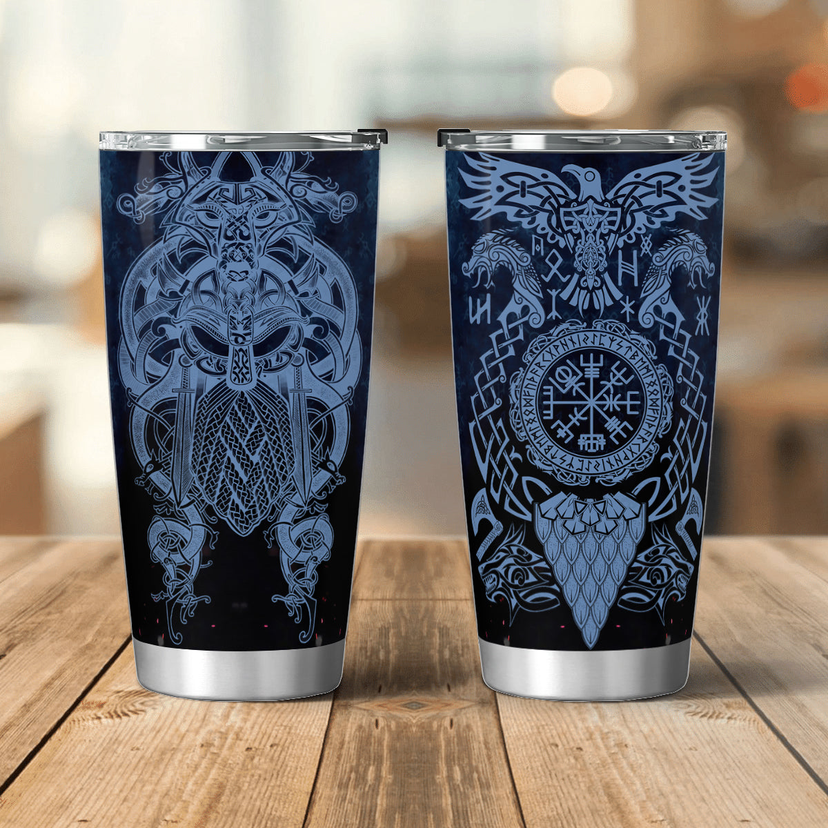 Elevate your beverage experience with the Mijonir Norse Mythology Tumbler, a striking blend of ancient Viking heritage and modern craftsmanship. This tumbler features vivid, detailed artwork depicting the Allfather Odin, accompanied by his loyal ravens Huginn and Muninn, alongside intricate runic patterns that tell tales of old. The opposite side showcases a powerful Norse-inspired design, embodying the strength and mystique of the Viking culture.