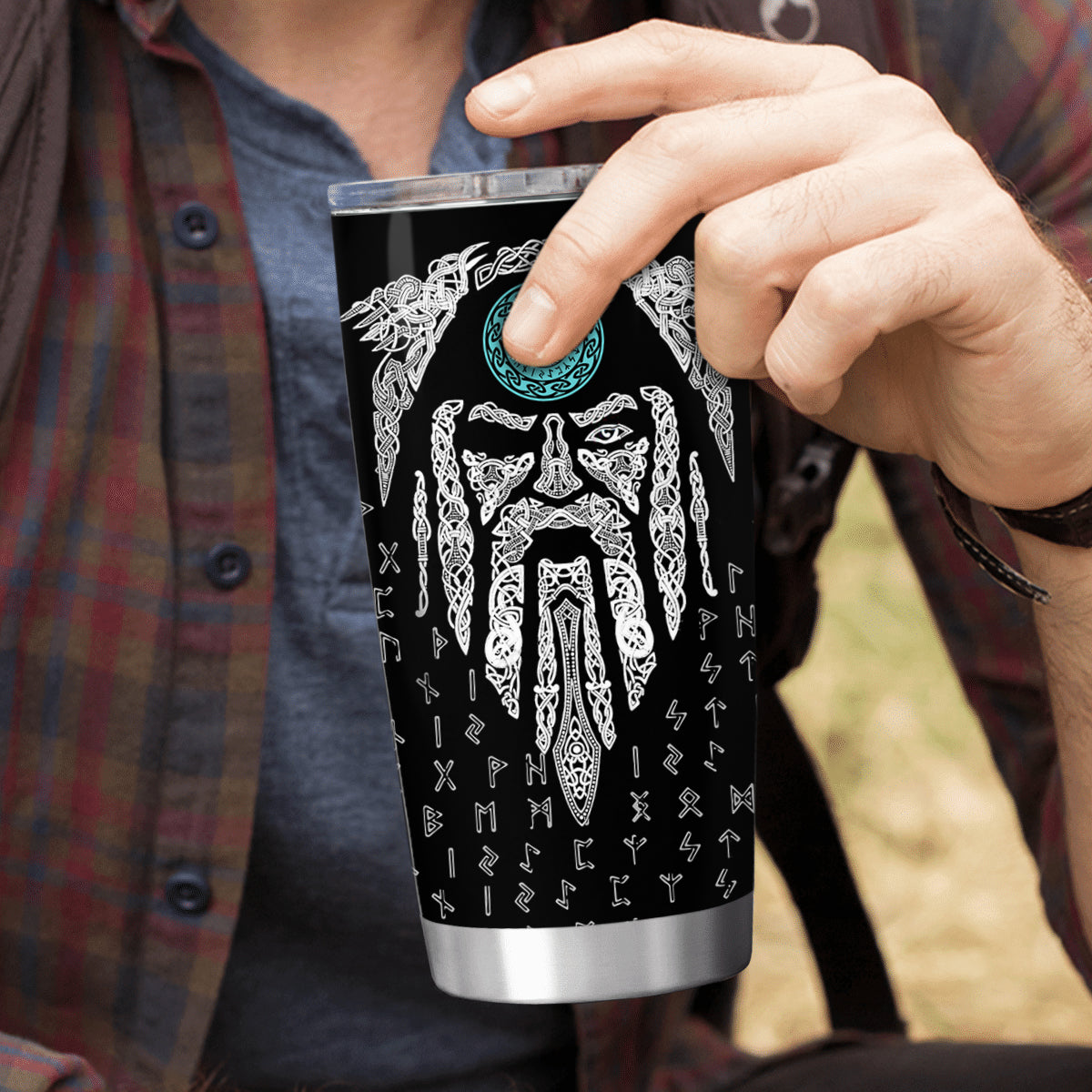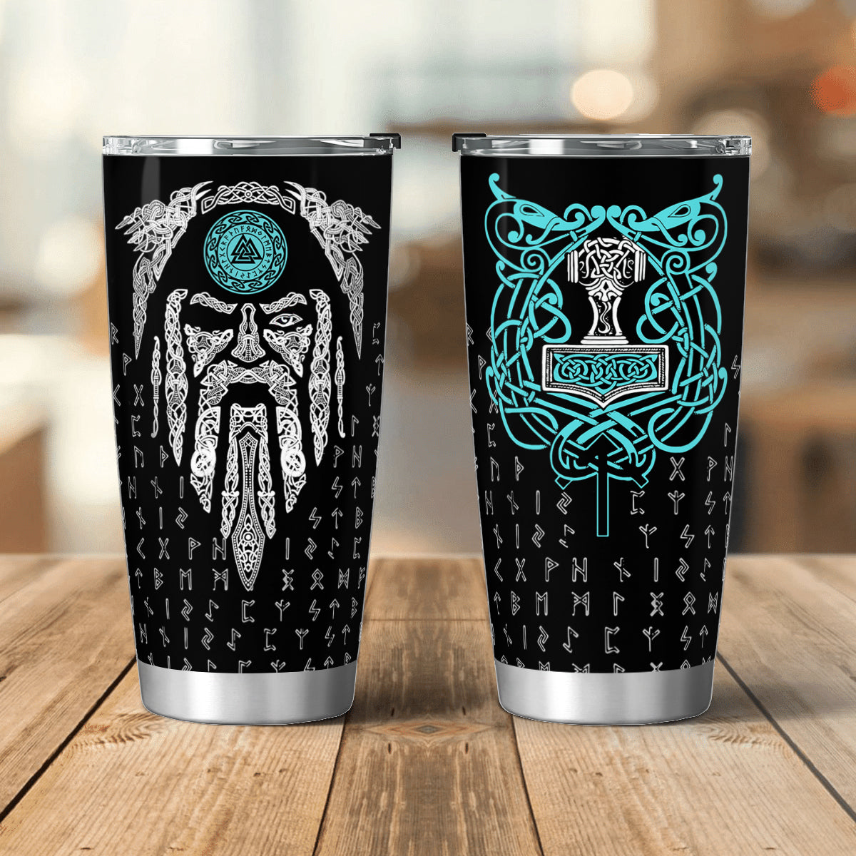 Embrace the divine knowledge and power of the Allfather with the Mijonir Odin's Wisdom Tumbler. This stunning tumbler features a mesmerizing design that brings the legendary Norse god Odin to life, adorned with intricate knotwork and the Valknut, symbolizing the eternal cycle of life, death, and rebirth. On the reverse side, Thor’s mighty hammer, Mjolnir, is encircled by Celtic knots in a vivid turquoise hue, embodying protection, strength, and the will of the gods. Surrounding both designs are ancient runes, invoking the mystical language of the Vikings.