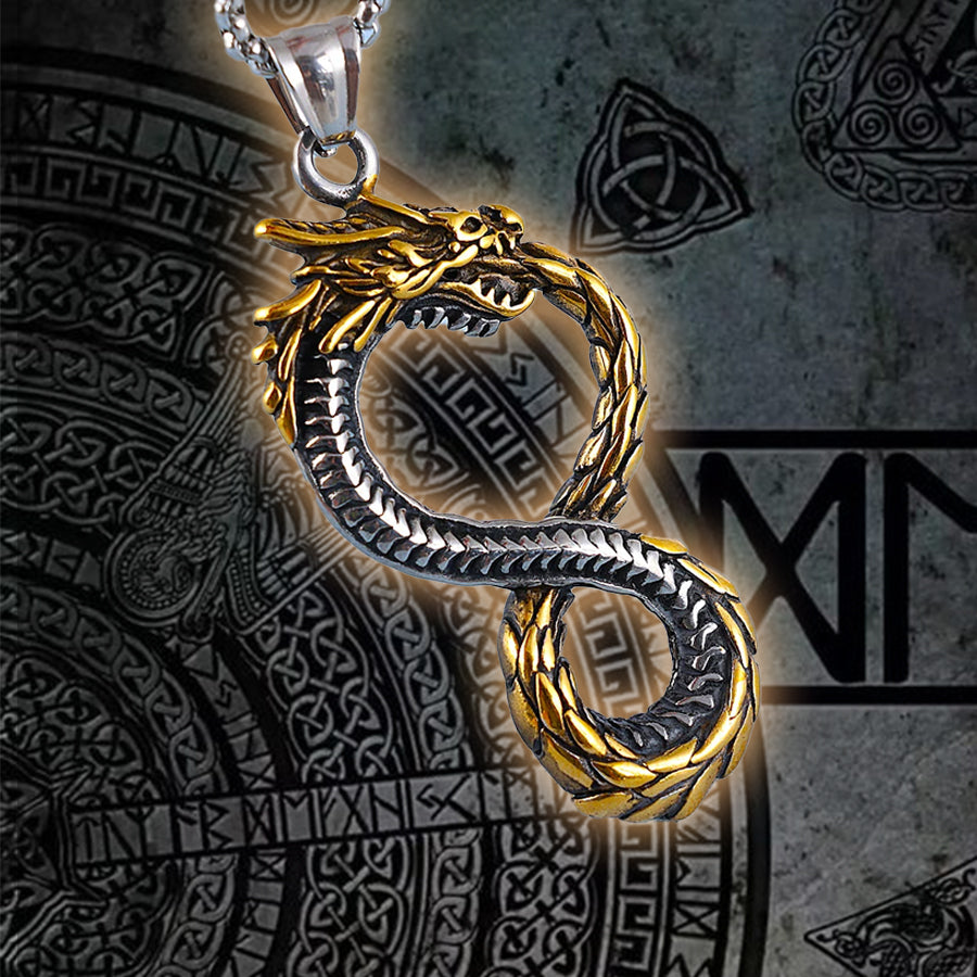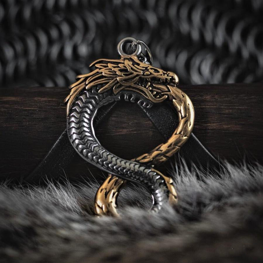 Jormungandr, the World Serpent, epitomizes the fierce tenacity of the fearless Norsemen. This exquisite Jormungandr necklace, a standout piece of Viking jewelry, showcases a finely crafted serpent with its tail coiled over its mouth, perfectly capturing the essence of this legendary creature. More than just an accessory, this Viking necklace is a symbol of the good fortune earned through relentless determination. Wear it to embody the indomitable spirit of the Vikings.