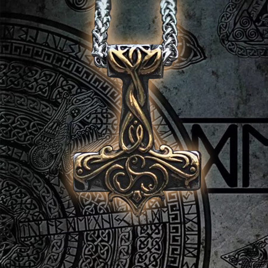 Step into the realm of Norse legend with this striking Thor's Hammer necklace. Forged from dual-color stainless steel and aged to perfection, this piece of Viking jewelry is a tribute to the god of thunder himself. The intricately designed hammer pendant, a symbol of strength and protection, will elevate your style to the heights of Asgard. Wear this Viking necklace and let the might of Thor guide your every step.