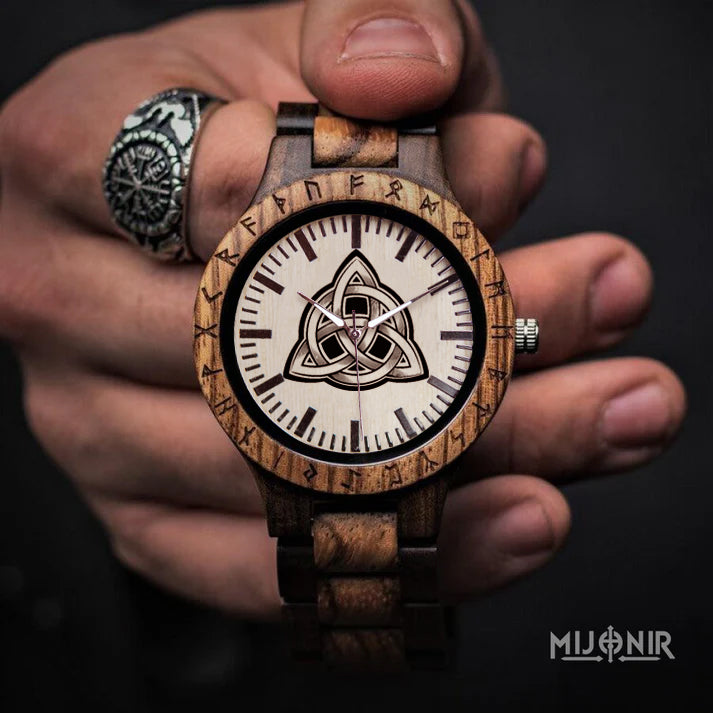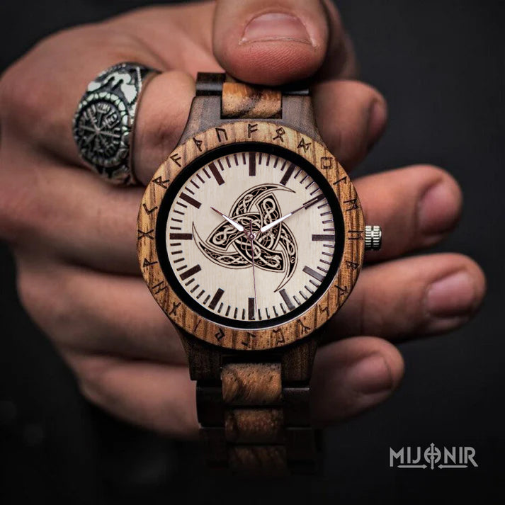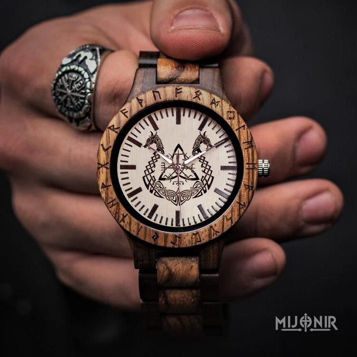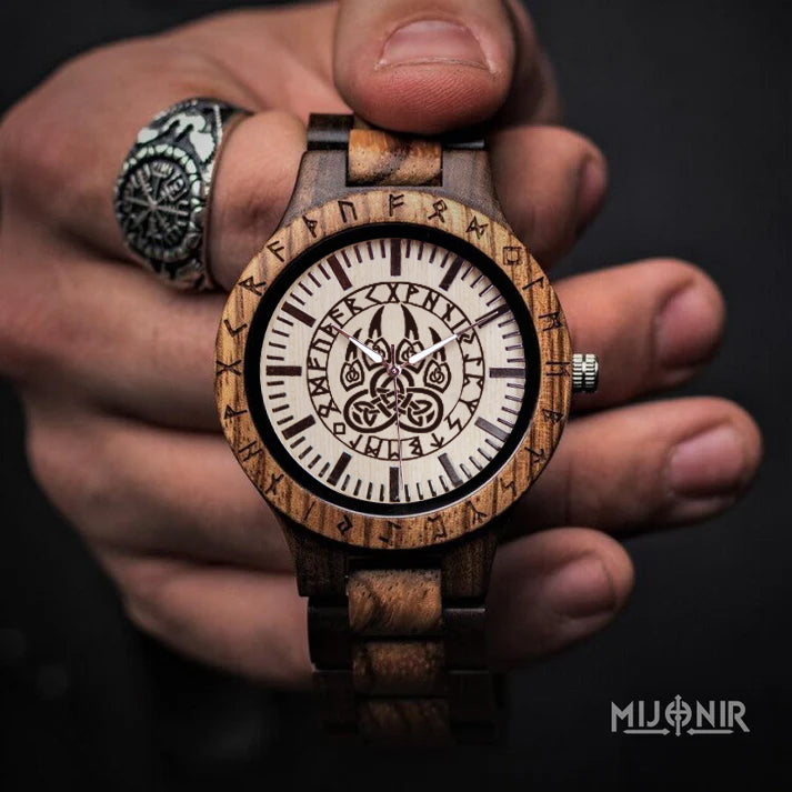 Showcase your unique and powerful style with the Viking Runic Wooden Watch. Crafted from premium natural wood, this watch is not only durable but also a stunning piece of art that reflects the rich heritage of Norse culture. The watch face is intricately engraved with ancient Runic symbols, paired with powerful Viking icons like Fenrir the wolf, Valknut, and other traditional symbols. This is the perfect accessory for those who appreciate Viking culture or want to add a touch of mystery to their collection.
