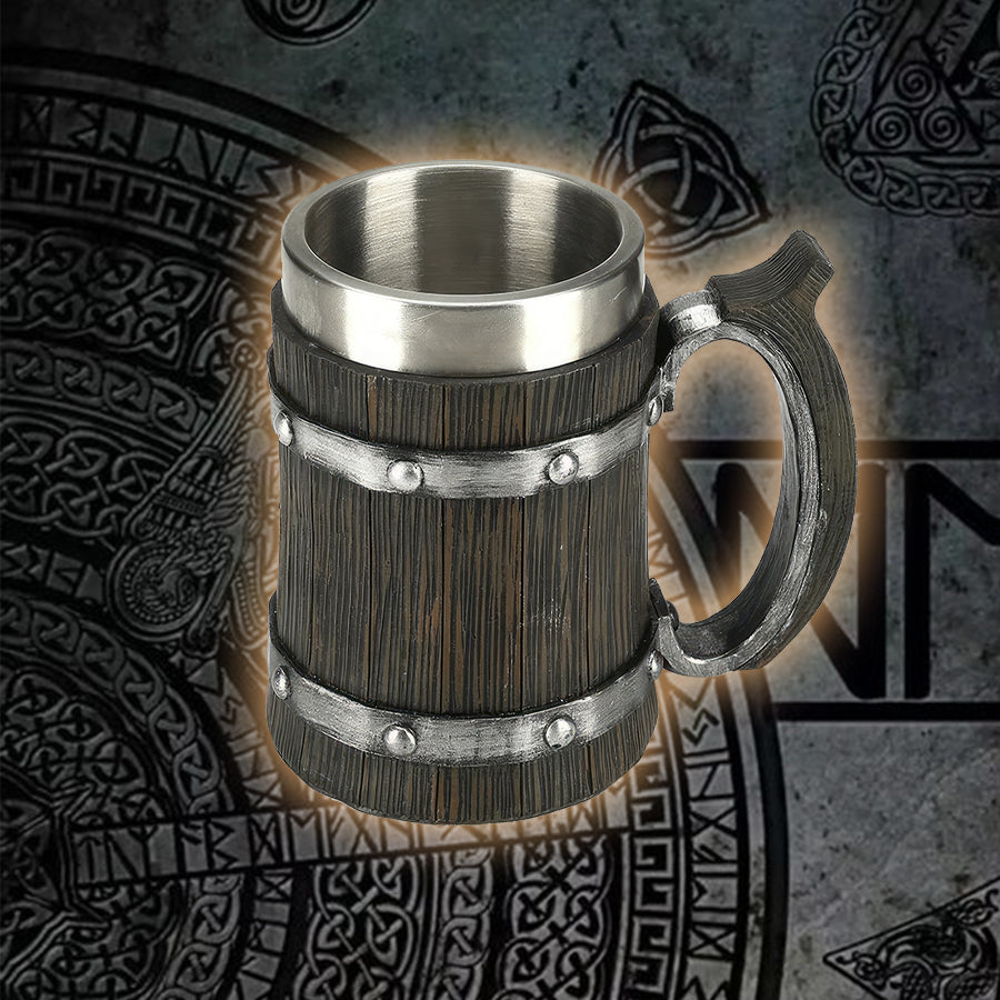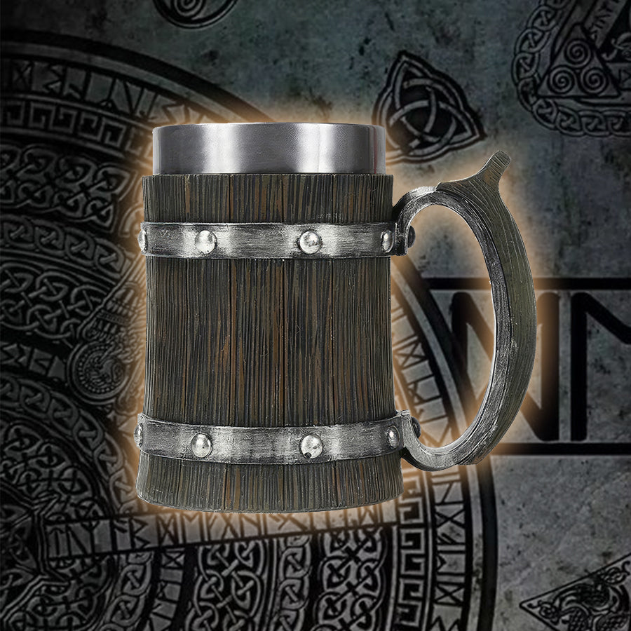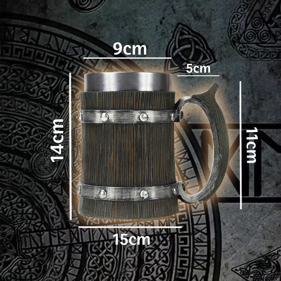 Viking Warrior Mug This 3D mug, crafted from stainless steel, boasts meticulous design and exceptional durability. The exterior is beautifully adorned with a wood-like texture that brings the rugged charm of ancient Norse culture to life. Featuring double-wall insulation, it keeps your beverages at the perfect temperature, whether hot or cold, making every sip of beer, coffee, or wine delightful. The ergonomic handle ensures a comfortable grip, adding to the mug's functionality and style. Perfect for themed parties, medieval reenactments, or simply enjoying your drink with a touch of historical flair, this Viking wood-style mug is a perfect blend of tradition and modernity. Elevate your drinking experience and channel your inner warrior with every use.